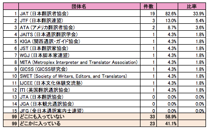 某かの通訳団体、翻訳団体に入っている人は 41.1%。想像通り、どこにも入っていない人が多く、約6割を占めています。