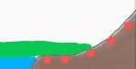 赤い点が、自分の所属する翻訳村だと思ってください。分野や取り扱う文書種類によって、どの村に所属するのかが決まります。海岸ぎりぎりなのか、山の中腹なのか、山のてっぺんなのか、標高はさまざまです。そして青色が海。緑色がMTによって上昇する海面です。