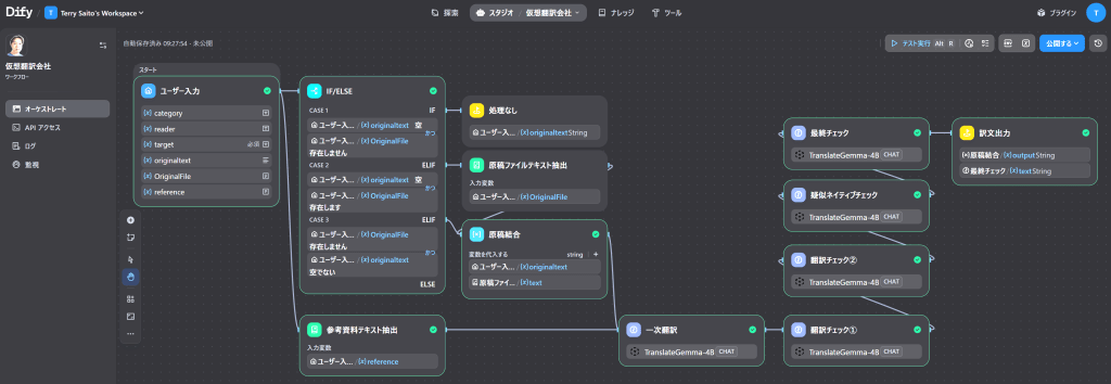 企業内で起こっている(だろう)ことを、最近私が使っているDifyというツールを用いた例で説明すると、イメージしやすいかもしれません。次の画像はDifyのスクリーンショットです。Difyは簡単にいえば、生成AIを使ったワークフロー(自動処理)を構築できるツールです。最近は、こういう種類のツールが続々と登場しています。